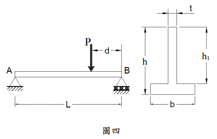 四、一載重 P 作用於簡支梁 AB 上,詳如圖四所示,若 P =6.2 kN,L=3.2 m,d=1.25 m, b=80 mm,t=25 mm,h=120 mm 及 h