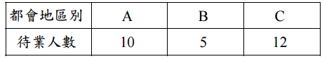 五、某社會問題研究人員欲瞭解 A, B, C 等三個都會地區的失業率是否有所不同,因此, 分別由此三個都會地區中隨機各抽出 100 位 15 歲以上的民眾,詢問其就業狀況 (即詢問其是否已就業或為待業中),而得到如下的資料: