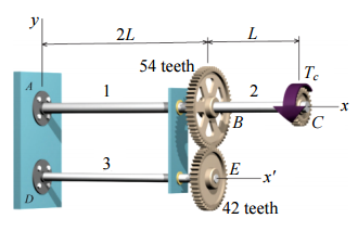 =380 N-m施加於如下圖所示之齒輪C,軸 1 及軸 2 皆為直徑 35 mm之實心 鋁製圓棒,而軸 3 為直徑 25 mm之實心鋁製圓棒,假設L=200 mm,G=28 GPa,試求 :