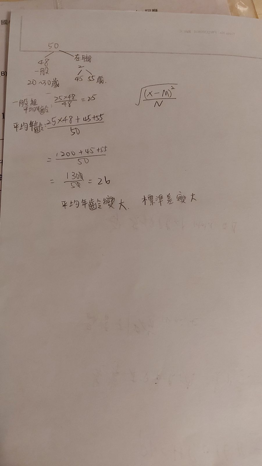 ⑴這 2 位在職組考生對於全體 50 名考生的平均年齡與標準差的計算有何影響? (請列舉統計公式來說明你的答案)