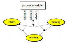 三、作業系統中程序排程器(process scheduler)負責切換程序(process)的三種狀態: ready、running 和 waiting state,如下圖所示。