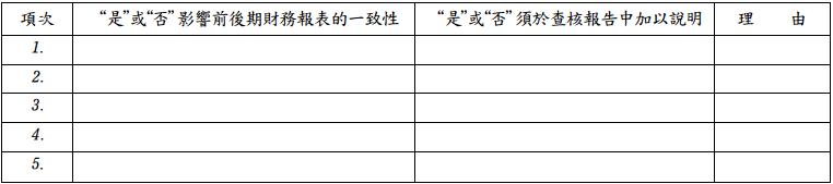 四、受查客戶會計選擇的改變可能會影響前後期財務報表的一致性,試說明下列五項會計 變動或錯誤是否會影響前後期財務報表的一致性,及是否須於查核報告中加以說明: 1會計估計的變動 2誤用會計原則所做的更正 3會計原則的變動 4分類及重分類的改變 5前期會計錯誤(非屬會計原則的錯誤)的更正 請於試卷上依下列格式作答,否則不予計分:(15 分)