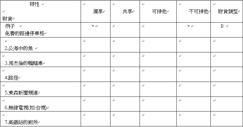 一.試判斷下表中第各項財貨具有何種特性(請勾選之),並於最後一欄寫出該財貨屬於哪一種財貨 A.純私有財 B.準私有財 C .純公共財 D.準公共財