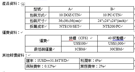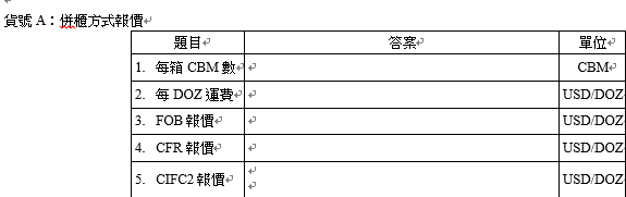 注意事項: 1. 核算要求:計算過程無法整除者,CBM計算至小數點第4位,四捨五入後取3位;其餘請計算至小數點第3位,四捨五入後取2位。 2. 佣金計算方式:以所求報價條件本身為佣金計算基礎,如FOB&C與CIF&C分別為FOB與CIF為基礎之含佣價。