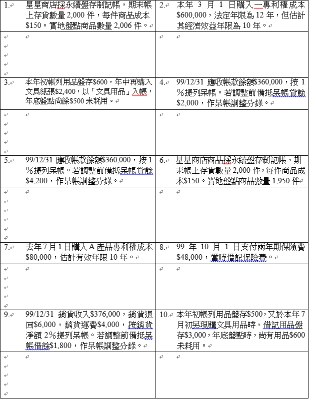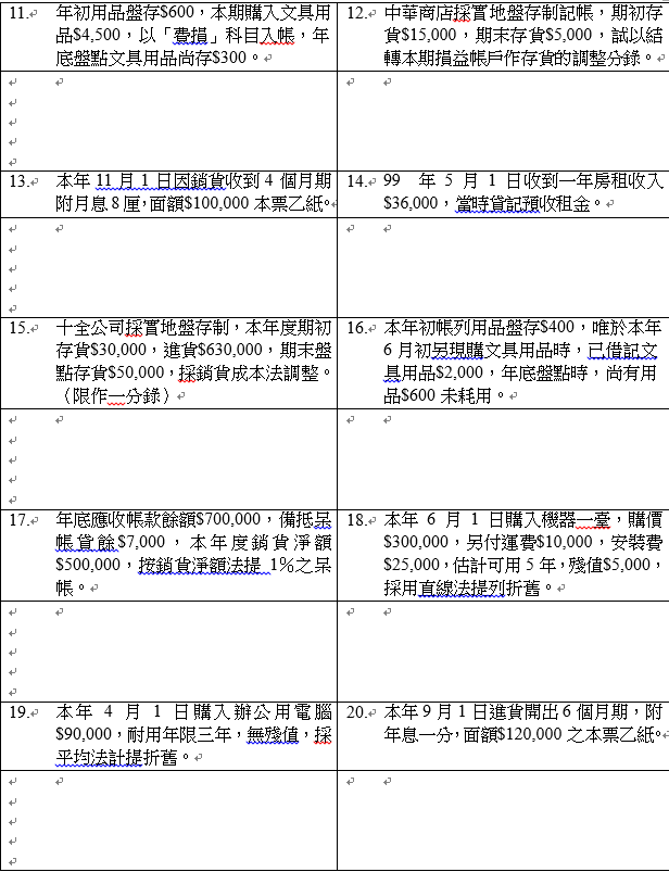 二、試作下列年底之調整分錄(@2.5分,50分)