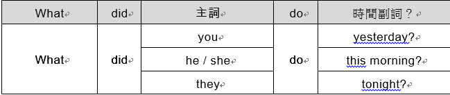 A. 詢問對方過去某時做了什麼事? B.簡單回答上述問題 ※用what造問句時,回答時不能有yes / no。 Ex: 請依據範例,利用提示字造句: 範例:Jacky / this afternoon / wipe the table What did Jacky do this afternoon? He wiped the table this afternoon.