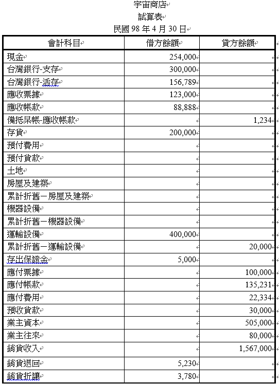 一、宇宙商站成立於民國97年10月1日,於95年12月初將會計作業電腦化,該商店會計處理如下: 1. 截至98年4月底宇宙商店所採用的會計科目及各帳戶餘額如下表所列。 2. 商店採曆年制,記帳基礎採先實後虛,期初作轉回分錄。 3. 存貨處理採實地盤存制。 4. 本試題不考慮營業稅。 5. 金額計算至元位止,以下四捨五入。 6. 本題報表呈現請依試算表科目(不得增設科目)順序作答。 7. 會計人員(製表人):acc