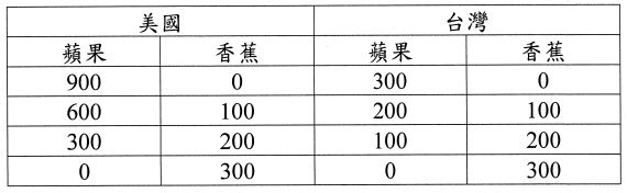 (一)請以香蕉為橫軸,蘋果為縱軸,於同一圖內分別畫出美國與台灣的生產可能曲線。(3分)