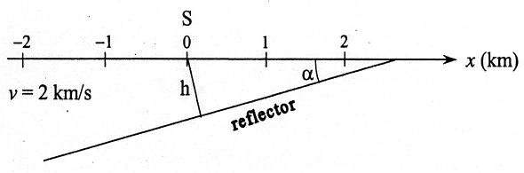 四、下圖表示某地區在地表附近有一個傾斜反射面,其上方介質P波速度均為 2km/s,α=30°為傾斜角,原點輿傾傾斜面的距離h為1.2km。在震測中,P波 震源S在地表x=0處,接收器排列在地表。