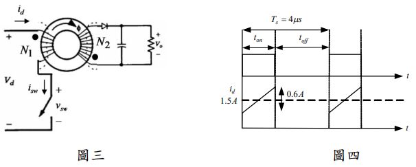 二、某電路如圖三所示。假設電路中皆為理想元件,且電容值夠大,可忽略輸出電壓漣波。輸入電壓為 25 V,變壓器匝數比為 N1 : N2 =1: 3。該開關 (SW)切換頻率 250 kHz,且導通時間比例為 1/3。其穩態輸入電流波形如圖四所示。