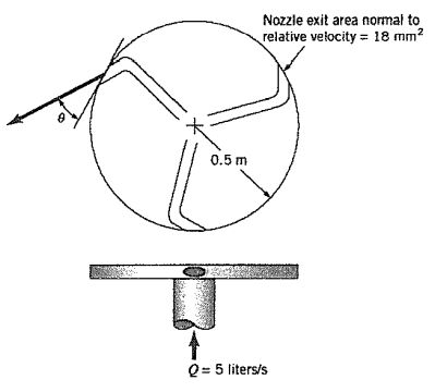 5. Five liters per second of water enters the rotor shown below along the axis of rotation. The cross-sectional area of each of the three nozzle exists normal to the relative velocity is 18 mm². How fast will the rotor spin steadily if the resisting torque is reduced to zero, and