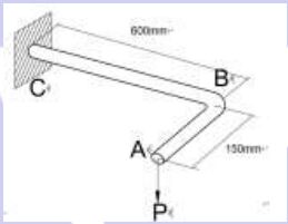 第三題 水平L型桿,AB長度為150mm,BC長度為600mm,其斷面為圓形,直徑為50mm,在桿 的自由端承受一個P=200N的垂直力,試求: