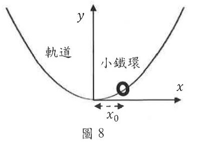 十、一抛物線軌道用不會變形的鋼絲所製成,並固定於鉛直面上在此鉛直面上,拋物線軌道滿足:y=cx2,c是一個常数。一個質量為m的小鐵環,套在抛物線軌道上,將鐵環移至距最低點的水平距離X0處(如圖8所示)·自靜止釋放。假設鐵環與軌道問的摩擦可以忽略,因為x0很小,故cx0<<1。在接下來的運動過程, 鐵環第一次回到出發點所需要的時間是 (15) 。當鐵環到達拋物軌道最低點时,軌道對鐵環的施力F為F=mg+ (16)