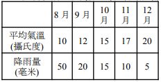 ◎ 下列圖、表是南美洲某個都市8-12月的氣溫、降水資料和一張未完成的氣候圖。