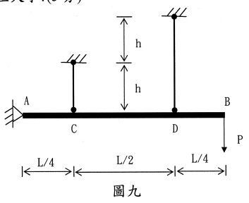 六、 如圖九,AB為一剛性桿,在C、D點各以一鋼線支撐,兩鋼線之截面積均為A,彈性係數E,求