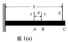 (一)圖 1(a)懸臂樑受在 A、B 及 C 分別受 f,f 及 F 垂直力,其中 ℓ 及 d 表距離,請繪出懸臂樑之自由體圖。