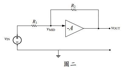 二、如圖二所示電路,包含增益為−A 之單輸入反相理想放大器。因此,當此單輸入反相理想放大器之輸入電流為零,vOUT = −AvMID。