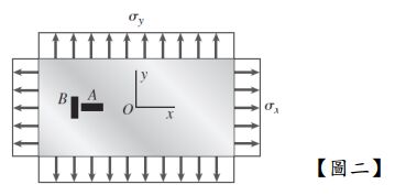 如【圖二】所示,矩形鋼板受到均勻正向應力σx及σy作用。應變規 A 及 B 附著於鋼板 上,應變規 A 讀得應變 0.00065,B 讀得應變為 0.0004。已知材料的楊式係數為 200 GPa 及蒲松比為 0.3,請列式計算下列問題: (四捨五入計算到小數第二位)