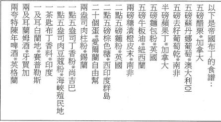 一九二十六年十二月二十日,帝國日運動(Empire Day)的籌備者米德勛爵邀請各殖民地代表,到倫敦英 僑聯盟所在地製作帝國布丁。每一種食材都由包著頭巾的印度僕人送上,並且像賓客抵達舞會時那樣,煞有其事地宣布大名,才加入巨大的混料碗中,儀式最後由來自加拿大、澳洲、南非、英屬蓋亞那、牙買加與印度的代表,一同攪拌布丁。
