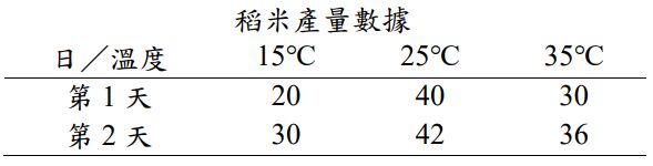 四、農業試驗所的研究員想要知道稻米產量是否受到溫度影響,決定設計實驗收集資料,並進一步分析結果。研究員先決定三個不同的溫度,限於人力,一天只能做三個實驗,每天的三個實驗必須控制不同的溫度各做一次實驗,且每個溫度的實驗順序是隨機的。實驗總共要進行兩天完成。每天不同溫度下的稻米產量實驗數據如下表所示(單位:百公斤)。