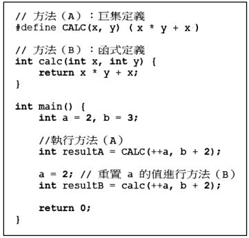 (三)若將方法(A)修正為: #define CALC(x, y) ((x) * (y) + (x)) 以便解決運算優先順序之問題,請說明是否可以得到與方法(B)相同 的結果?