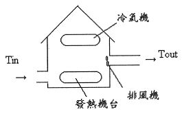 五、 房內有相同發熱率的機台 10 部,每台的發熱率為 6kw;同時開動房內之冷氣機,冷房能力 (冷氣機能從室內吸走之熱率) 為 118,800BTU/hr (1BTU = 1055 Joule (焦耳),hr 為小時);另在房內右側牆上裝有排風機,左側牆下為室外空氣進口,若進口之空氣溫度為 (25℃),排風機出口處之空氣溫度為 。(假設房子四周上下牆壁絕熱且機器運轉達穩定) 請問: