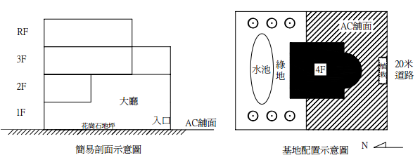 五、某基金會於臺灣南部某鄉鎮設置一棟四層鋼筋混凝土造展覽館,開放時間為每日09:30~18:30,四周空曠無建築物,現況如下列圖示,至今已使用 20 餘年。