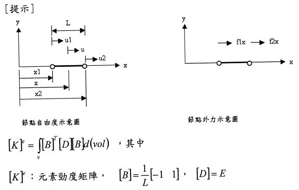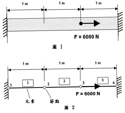 三、下圖1所示,為兩端固支撐,承受軸向負荷(axial loading)的1維桿件結構數(E)為100x109 Pa,長度度為3m,裁面積A為0.01m2,在節點3施加6 力。如下國2所示,將此样等分成3個元素,試求下列解答:
