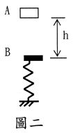 二、 如圖二,一質量20kg之物塊A,自高度h=2m處落下,另一質量10kg之物塊B,固定於彈簧上方,彈簧常數k=10KN/m,假設物塊A與B之碰撞屬於完全塑性碰撞,試求