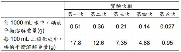 後,則碘在水與在二硫化碳中之平衡溶解重量分別約為多少 g?【10 分;未列出