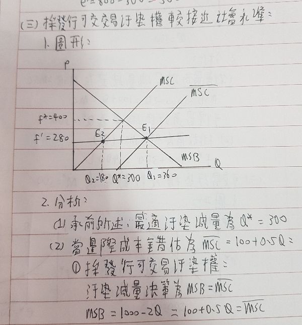 二、若社會污染減量的邊際利益(MSB)與邊際成本(MSC)分別為