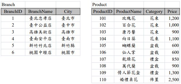四、欣欣是一家連鎖網路花店,為了有效管理各分店的營運情形,店長建立了三個資料表:Branch、Product 與 Sales,其中 Branch 用來記錄分店資料,