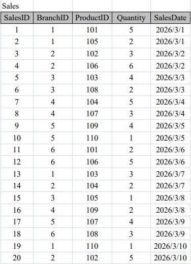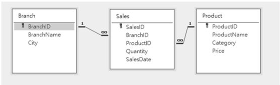 Product 用來記錄花店商品資料,Sales 則用來記錄各分店每日的銷售明細。各資料表的重要欄位包括:BranchID 為分店編號、ProductID 為商品編號、