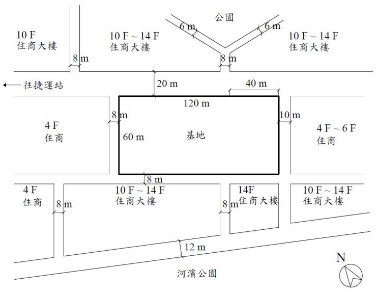 (二)基地條件,如【圖1】所示: (1)基地大小為60mx120m,北臨20m道路,東臨10m道路,西及南侧侧臨8m巷道。