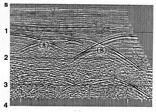 (二)下圖為震測資料處理過程中展示的震測剖面,請問圖中A、B所處位置的真實地質構造形貌為何?說明造成此種假象的效應及去除此種效應 的處理步驟。