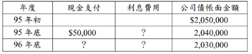 二、乙公司於95 年初發行公司債,面額$2,000,000,每年底付息一次,相關資料如下: