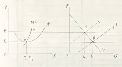 短期下價格不變為P0時,P=AC有正常利潤價格上升至P1時,P>AC產量增加,有超額利潤故利潤增加