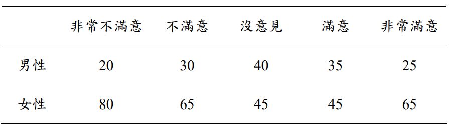 四、某研究欲探討性別與服務滿意度之間是否具有關聯。研究者針對顧客進 行問卷調查,並將受訪者依「性別」與「服務滿意度」進行分類,得到 以下交叉表資料(單位:人次):