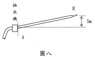 (二)如圖八,某一輸水管出口處(B端)之直徑10cm,以0.1CMS(=m³/sec)之流量噴出,若A斷面前端以一部抽水機加壓,A斷面處之直徑為20cm,與B端之高差為5m,求經抽水機加壓後,A斷面處之壓力PA?