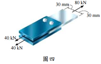 四、如圖四所示之接頭由兩支螺栓固定,假設板厚皆為 12 mm,材料之剪力強度為 350 MPa,抗拉、抗壓強度皆為 600 MPa,並可忽略摩擦之影響。在設計安全係數 (factor of safety)要求為 2.5,且在下列各設計考量下,試求螺栓所需之直徑: (每小題 5 分,共 20 分)