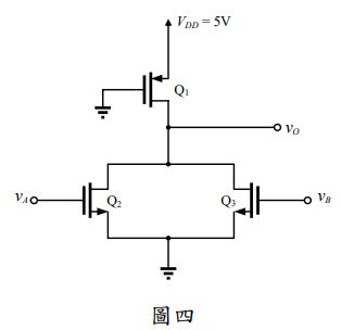 四、圖四為一個 Pseudo NMOS 邏輯電路,電晶體 Q1、Q2 與 Q3 的參數如下: Vt1 = -1 V,Vt2 = Vt3 =1 V, μnCox = 4μpCox,(W/L)2 = (W/L)3 = 4(W/L)1, VDD = 5 V,忽略通道長度調變(Channel Length Modulation)與基底效應 (Body Effect)。請計算: