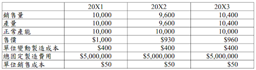 (二)與前題(一)之情況獨立,假設甲公司為了維持其產能利用率之穩定,自 20X2 年起 改變其生產模式,每一年之產量均維持在其正常產能水準,即 10,000 單位,其 他假設則與前題相同。試就本題之假設,決定甲公司 20X2 與 20X3 年之銷貨毛 利,包括因存貨續後評價以及少(或多)分攤固定製造費用之必要調整。(6分)