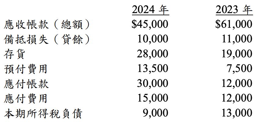 甲公司 2024 及 2023 兩年底比較資產負債表中的相關資訊如下: 該公司 2024 年度中曾沖銷無法收回之應收帳款$5,000,2024 年度之 綜合損益表資訊如下: