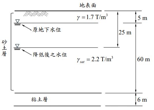 (二)若現場地下水位因抽水而下降至地表下 25 m,試求粘土層因地下水位下降而引起之壓密沉陷量?(提示:再壓指數為壓縮指數)