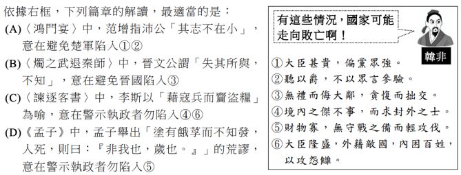 (二)請替韓非六項說法分類並說明韓非的思想內涵(12 分),未來在教學中將如 何利用這些思想內涵說明、對照、補充延伸在題幹所提的四篇文本。(8 分)