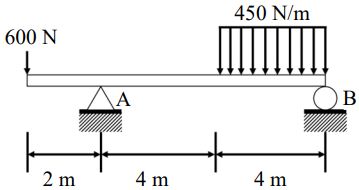四、如圖所示,有一樑受外部負載,於支承A左方2m受一集中負載600N,於支承A右方4m至支承B受一均布負載450N/m。
