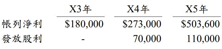 三、丙公司成立於 X3 年初,X3、X4、X5 年帳列淨利與發放股利資訊如下: