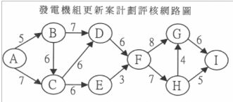 7。假設某電廠欲更新發電機組,其事件與預期工作時間所繪出之計劃評核網路圖如下,請問其發電機組更新案之要徑(Critical Path)為何?要徑所需時間為何(單位:月)