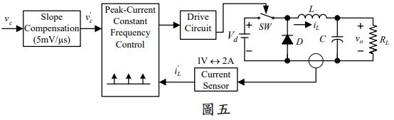 三、某電路如圖五所示,輸入電壓為 25 V,電感為 0.5 mH,負載電阻為=10 Ω。該電路係採用具斜率補償(Slope Compensation)之固定頻率 型峰值電流控制(Peak-Current Constant Frequency Control) ,切換頻率為 12 kHz,電流信號轉換比例為 1 V/2 A。假設電容值夠大,可以忽略輸出電壓漣波。輸出電壓穩定控制在 15 V。