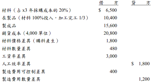 二、丙公司於x3年開始生產一項新產品,並採用標準成本會計制度;新產品每單位依材料、人工與製造費用2:1:1的標準成本設置。x3年各項目餘額如下: